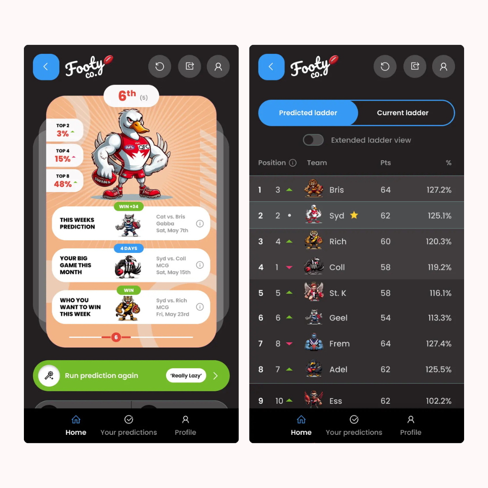 We built a cross-platform AFL ladder prediction app for Footy.co that processes 250 matches instantly and delivers predictions in 2-3 seconds. The founder had spent years developing mathematical algorithms that modeled AFL results based on stadium conditions, team history, rest periods, and hundreds of variables.